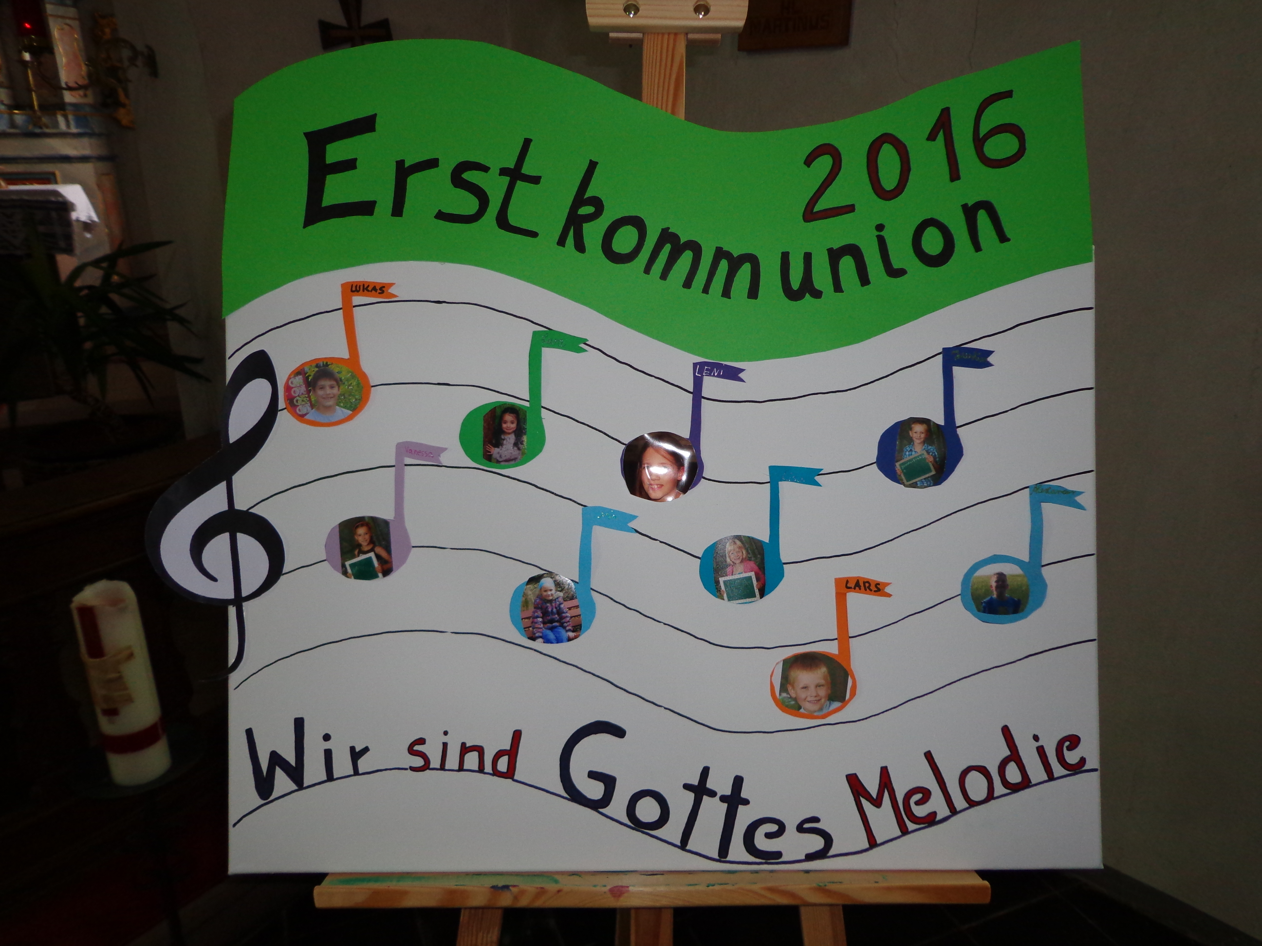 Am Sonntag dem 17.April 2016 empfangen Hennen Leni, Jakobs Lukas, Schneiders Lars und Dapper Alexander das eucharistische Sakrament der Erstkommunion. Unter dem Motiv „Wir sind Gottes Melodie“ haben sich die Kinder mit Ihren Katechetinnen für diesen Tag lange, und gut vorbereitet. Am Ende der Vorbereitungszeit wünsche ich unseren Kommunionkindern, dass sie Jesus als Freund erfahren, und ein Leben lang von Jesus im christlichen Glauben begleitet werden.