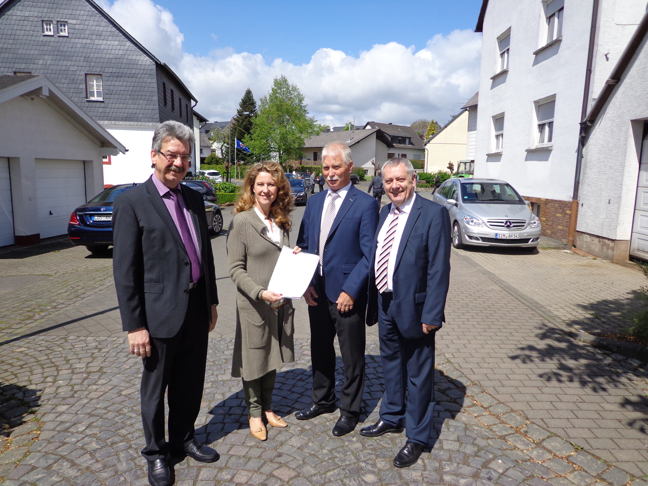 Heike Raab, Staatssekretärin im Ministerium des Inneren, für Sport und Infrastruktur hatte erfreuliche Nachrichten aus Mainz im Gepäck: Persönlich überreichte sie die Zuwendung aus dem Investitionsstock 2015 an Ortsbürgermeister Otto Schneiders. Verwendung findet das Geld für eine barrierefreie Umgestaltung der Haupt- und Kirchstraße in der Ortslage Weiler. Hier suchte der Gemeinderat nach Lösungen, eine dem Ortsbild entsprechende Gestaltung eines Gehweges zum Friedhof und zur Kirche, zu bauen. Die Baumaßnahme die mehr als 20.000 Euro als Kostenfaktor vorsieht, wird mit 50 Prozent aus Landesmitteln gefördert. Die Zuwendung ermöglicht einen kurzfristigen Baubeginn, und der Ortschef, der allen beteiligten Verwaltungen dankte, hofft auf eine Fertigstellung noch in diesem Jahr. Freuen wird dies alle, die per Pedes oder mit dem Rollator untertwegs sind und den Weg im Dorf nutzen.