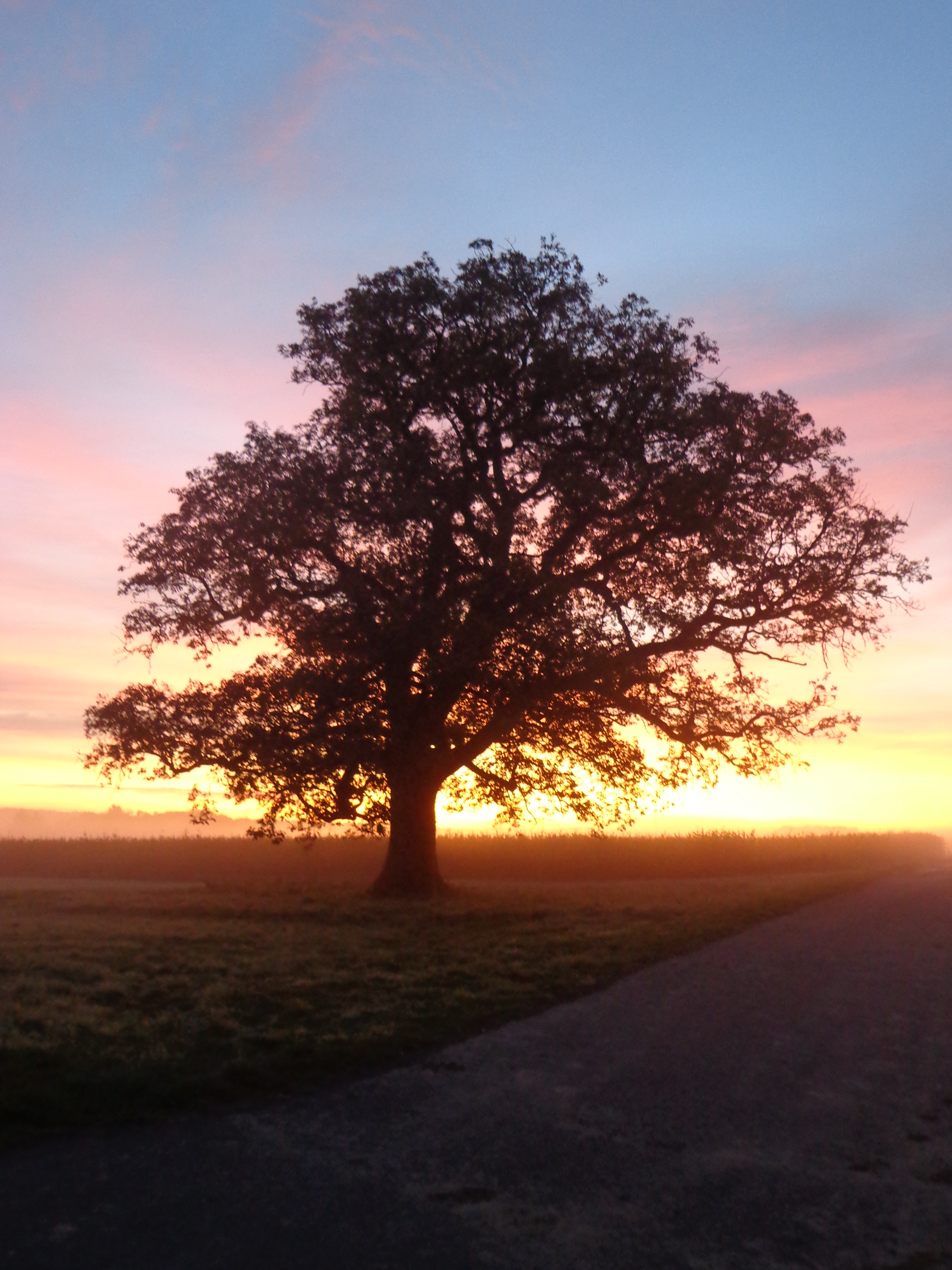 Manna Eiche im Licht der aufgehenden Sonne. Eindrücke beim Walking am Samstagmorgen.