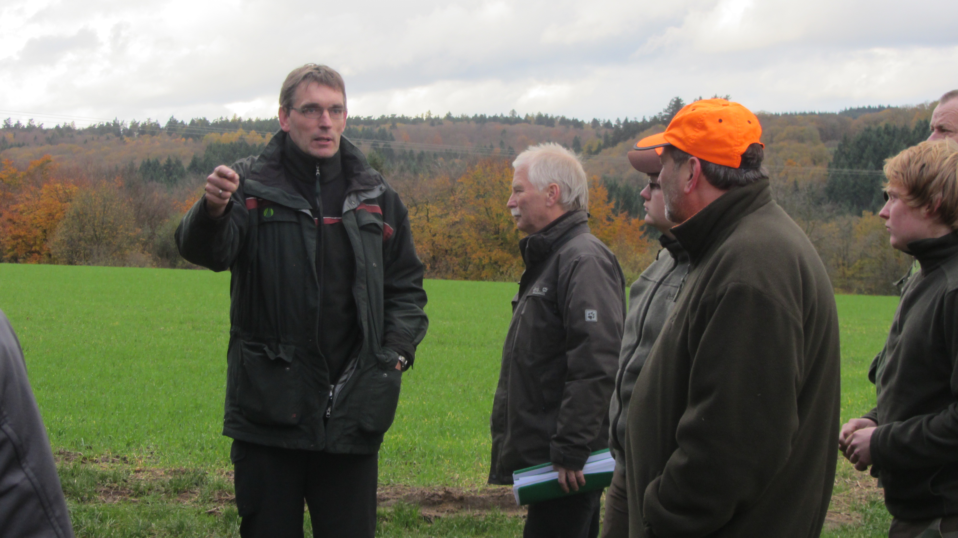 Jungbestandspflege, Aufforstung und Sauenklappen - ein Wunsch der Jagdpächter - waren die von Revierförster Jörg Herzog privilegierten Themen bei der diesjährigen Waldbegehung in Weiler. Eingeladen hatte Ortsbürgermeister Otto Schneiders der unsere Jagdpächter, viele Jagdscheininhaber, den Vorstand der Jagdgenossenschaft, Dorfbewohner, einige Mitglieder des Ortsgemeinderates, sowie unseren Revierleiter Herr Herzog begrüßte. Nach kurzer Einweisung in den Tagesablauf übergab der Ortschef, die fachliche Komponente und Führung an den Revierleiter. Bei der Jungbestandspflege müssen wir etwas Geld in die Hand nehmen denn die natürliche Astreinigung reicht hier nicht aus. Auch eine Ringelung ist in dem vorhandenen Nadelholzbestand nicht von Vorteil, denn dann bieten die geschwächten Bäume Vermehrungsmöglichkeiten für den Borkenkäfer. Der Bestand wird von unseren Forstwirten von Hand durchforstet und somit wird eine ordentlich Pflege durchgeführt, so der Förster. Zusammen mit der restlichen Aufforstungsfläche der letzten Stürme ist dies der Schwerpunkt im diesjährigen Forstwirtschaftplan und schlägt mit über 7000,- € zu Buche. Sauenklappen war ein Anliegen der Jagdpächter im Jagdbogen II in Weiler. In diesem Jagdbereich mussten durch den erheblichen Windfall bei den Stürmen vier großflächige Gatter angelegt werden, wodurch sich die Jägerschaft etwas gebeutelt fühlt. Hier müssen wir Konsensfindung erreichen um allen etwas gerecht zu werden. So war der Vorschlag vom Ortschef an einem von vier Gattern Sauenklappen zu erlauben, auch den Jagdherren recht. Die Klappen (Pendelklappen) erleichtern Sauen einen ungehinderten Zugang zu Forstkulturen und werden an Hauptwechseln eingebaut. Hierbei wird ein Gestell ca. 90 x 90 cm am Gatter befestigt und die Innenfläche mit Rundhölzern als Pendel verschlossen, um so den Sauen den Zutritt zu erleichtern. Die Klappen werden aber unter forstlicher Aufsicht zwei Jahre beobachtet und es wird hierbei besonders auf den Schutz der Kultur und die Sicherheit der Gatterung geachtet, so der Revierleiter. Das in Weiler immer heiße Thema Brennholz wurde noch von einigen Zuhörern hinterfragt. Für einige Jahre ist der Brennholzbedarf noch gesichert, so die Beteiligten. Eine Reduzierung der Menge pro Haushalt wird aber logischerweise kommen müssen, da im Dorf fast 70 % einen Ofen als Wärmequelle nutzen, führte Schneiders weiter an. Als Abschluss im Wald berichtete Rita Schneiders über ihre Ausbildung zur Waldpädagogin, und bot gerne eine ehrenamtliche Walderkundung mit den Dorfkindern, nach der Ausbildung 2014 an. Dies wurde mit einer flüssigen Stärkung an Niklas Hütte von allen Teilnehmern mit positiver Zustimmung aufgenommen. Die aktuelle Reduzierung der Waldflächen - keine Aufforstung nach Rodung bei Gemeinden von über 35 % Waldfläche - war noch ein brisantes Thema vom Ortbürgermeister. Der Spruch vom Landtagsabgeordneten Billen „Wir müssen den Wald vor den Grünen schützen“ wurde belächelt aber auch diskutiert. Letztendlich stimmten alle Teilnehmer zu, dass unser Wald als Nutzfunktion für die Umwelt dem Klima und dem Wasserhaushalt aber vor allem der Erholung dient. Beendet wurde die Veranstaltung, bei guter Verpflegung und Getränken von unseren Jagpächtern in Jagdbogen II, Mortlich Herr Richter und Herr Franken, im Gemeindehaus. Ein Dankeschön auch an Rita und Herbert für die flüssige Stärkung im Wald. Foto: Rolf Sawinski