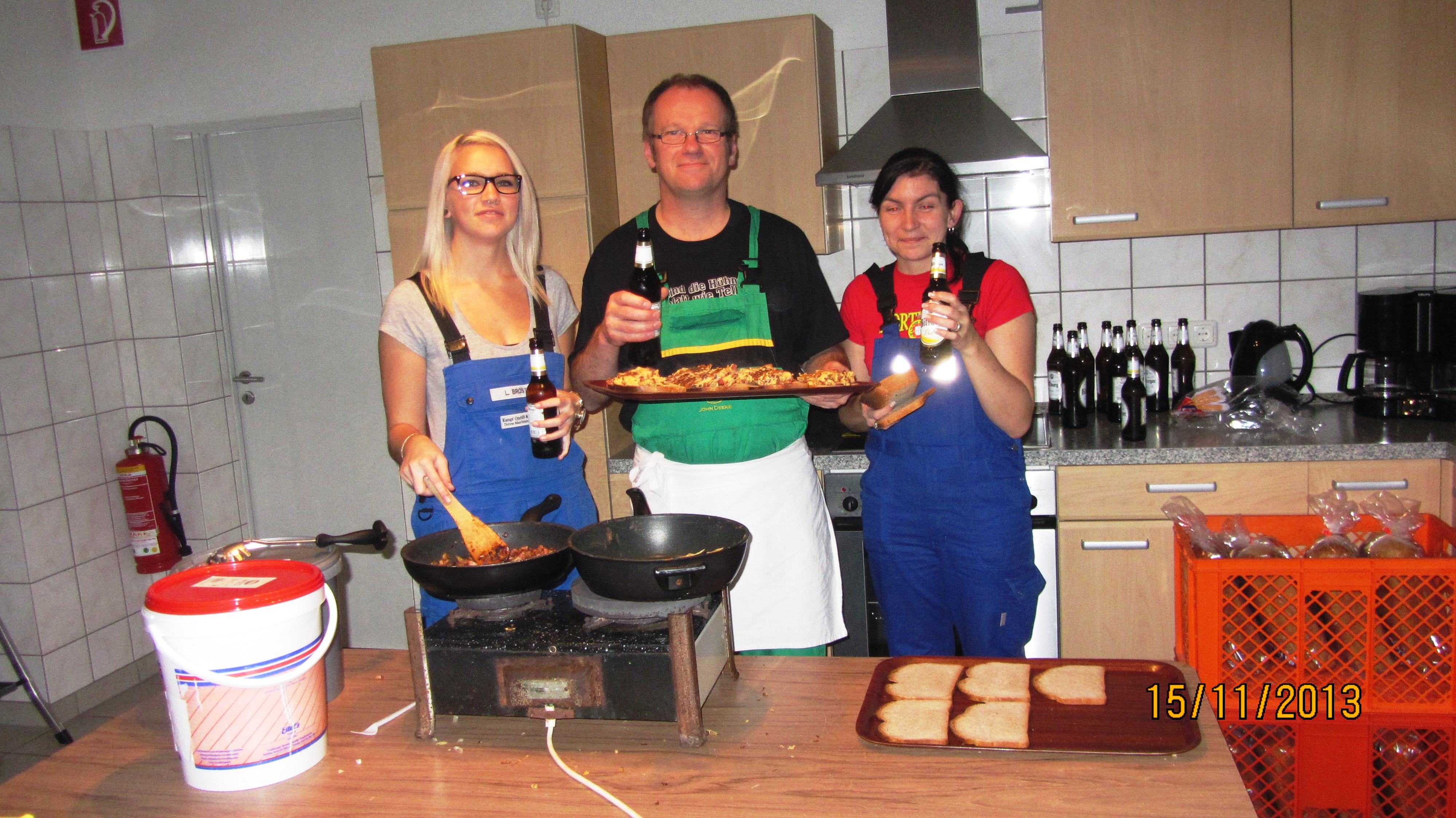 Gut versorgt mit Eierschmea wurden wieder alle Besucher des Latzeboksefest am Kirmesfreitag. Umgarnt (Lothi) von den hübschen Mädels, Kerstin Berenz und Linda Broeske musste die kostenlose Eierschmea gelingen. Foto: Rolf Sawinski