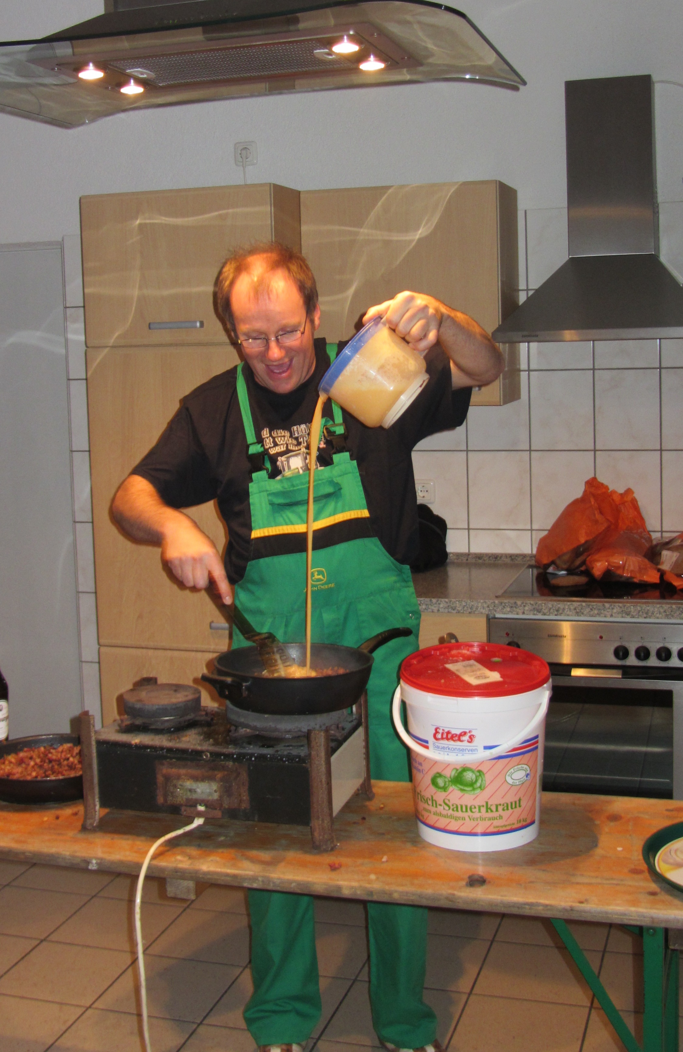 Eierschmea und Latzebokse waren wieder der Höhepunkt des Freitages an der Weilerer Kirmes 2012. Die Feuerwehr als Ausrichter der Kirmes zeigte sich zufrieden mit dem Besuch des diesjährigen Festes. Im Bild Lothi beim Anrühren der Eierschmea.