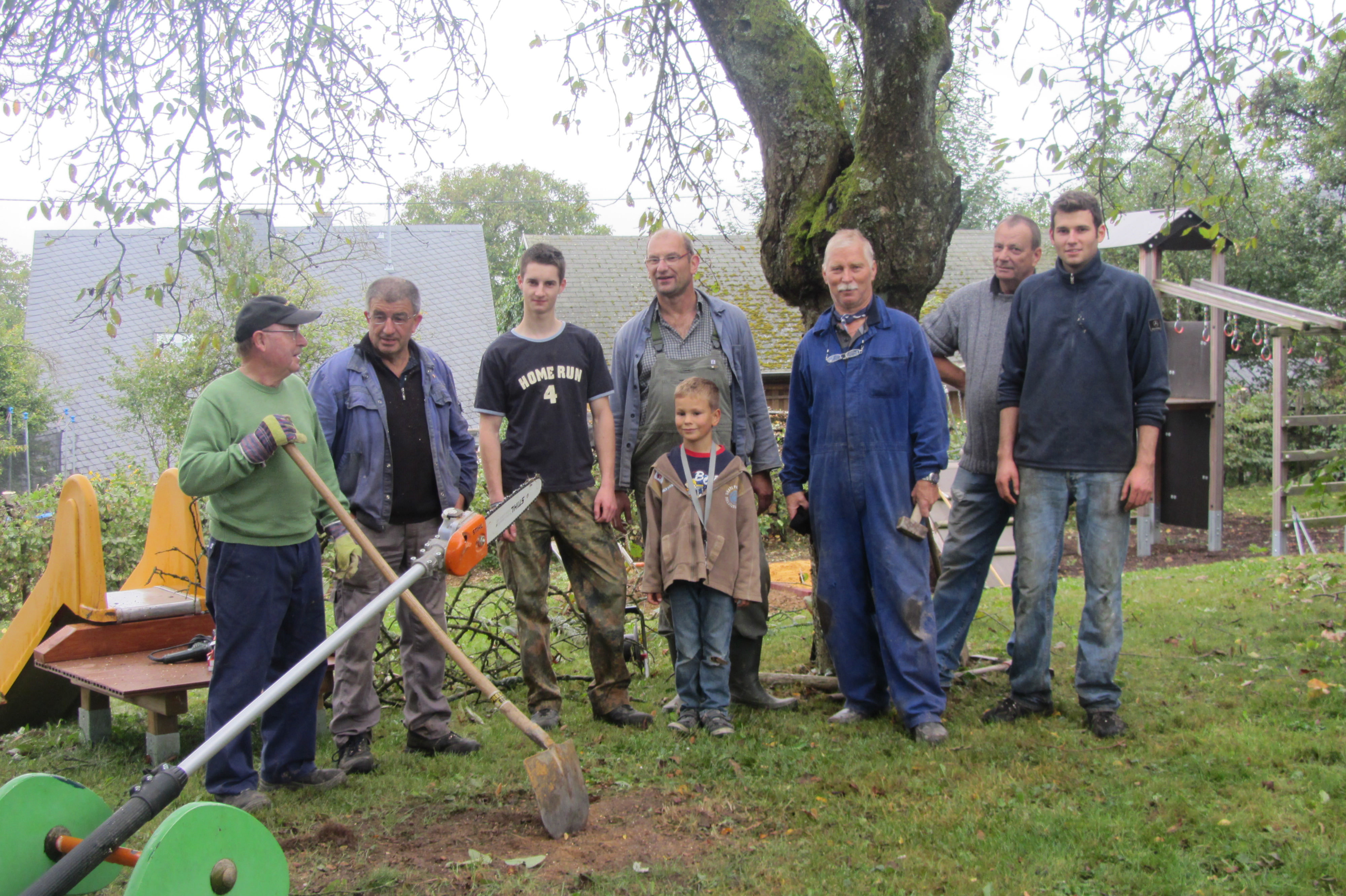 Um Gefahren und Verletzungen auf dem Spielplatz zu verhüten war wieder mal ein Arbeitseinsatz nötig. Die Verletzungsgefahren und einige Mängel bei der Sachkundigenüberprüfung mussten behoben werden. Hecken wurden beschnitten und einige Spielgeräte auf Vordermann gebracht. Freuen wird es unsere Kleinsten, denn jetzt ist neben dem Sandkasten auch die Rutsche nutzbar. Nicht auf dem Foto: Andreas Schmitz und Dieter Kellershoff.