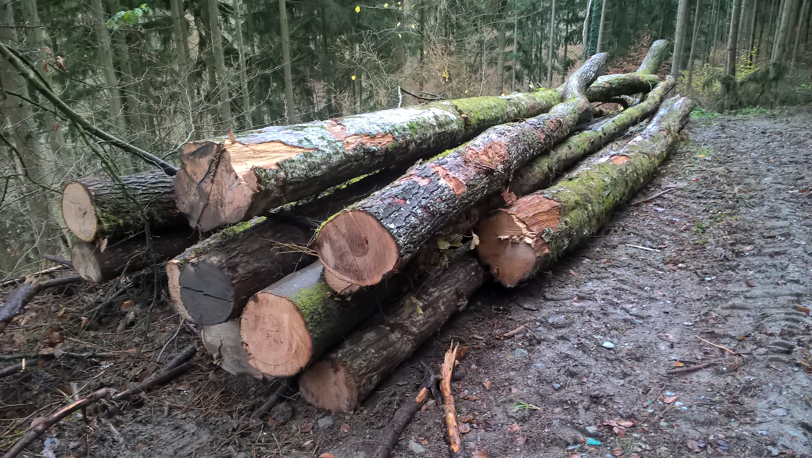 Die Versteigerung (Verfahren wie in den letzten Jahren) wird zeitnah im Vulkan Echo mitgeteilt. Im Bild: 1 Polter von 8 Poltern die im Ellerbachtal liegen. Einfahrt Borwiese.